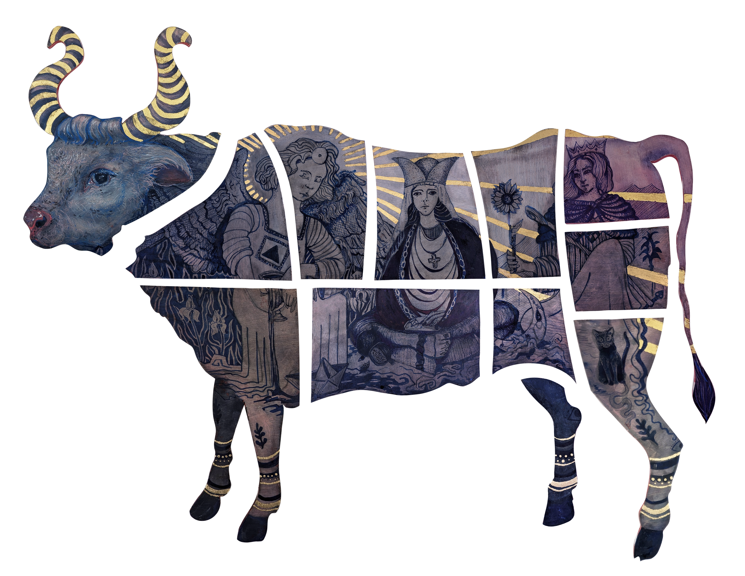 This piece draws from a deep well of symbolism, reflecting on societal ideals of femininity through the sacred image of the cow, revered in Hinduism for her nurturing role as she provides milk, nourishing humanity as her own. However, the sacred imagery of Temperance, the High Priestess, and the Queen of Wands is deliberately placed on the form of a bull, leaning into the troubling reality that even post-fourth-wave feminism, women's voices often go unheard unless a man carries their message. This stark contrast underscores the lingering inequality in a world that claims gender equality but continues to value male advocacy as more authoritative.