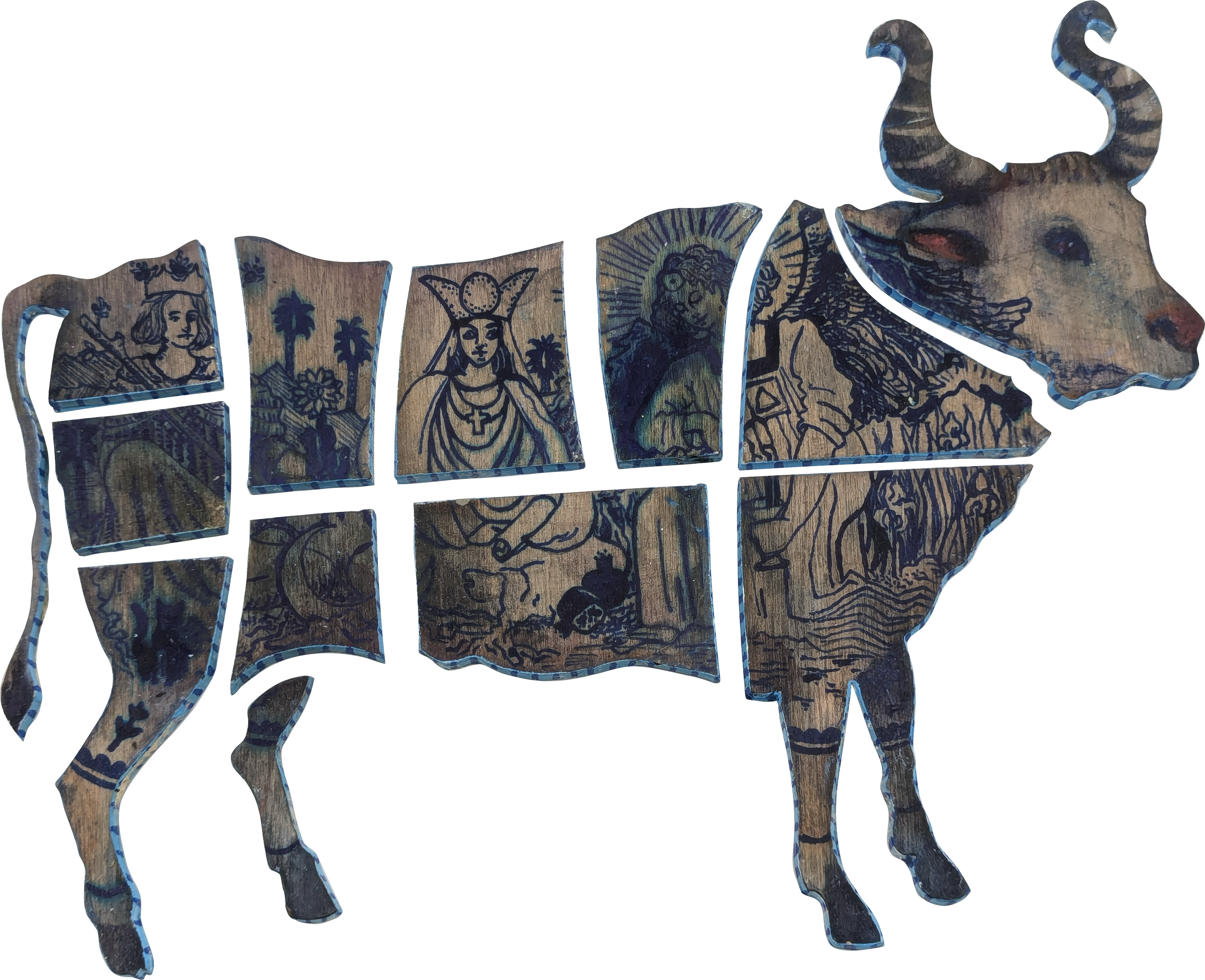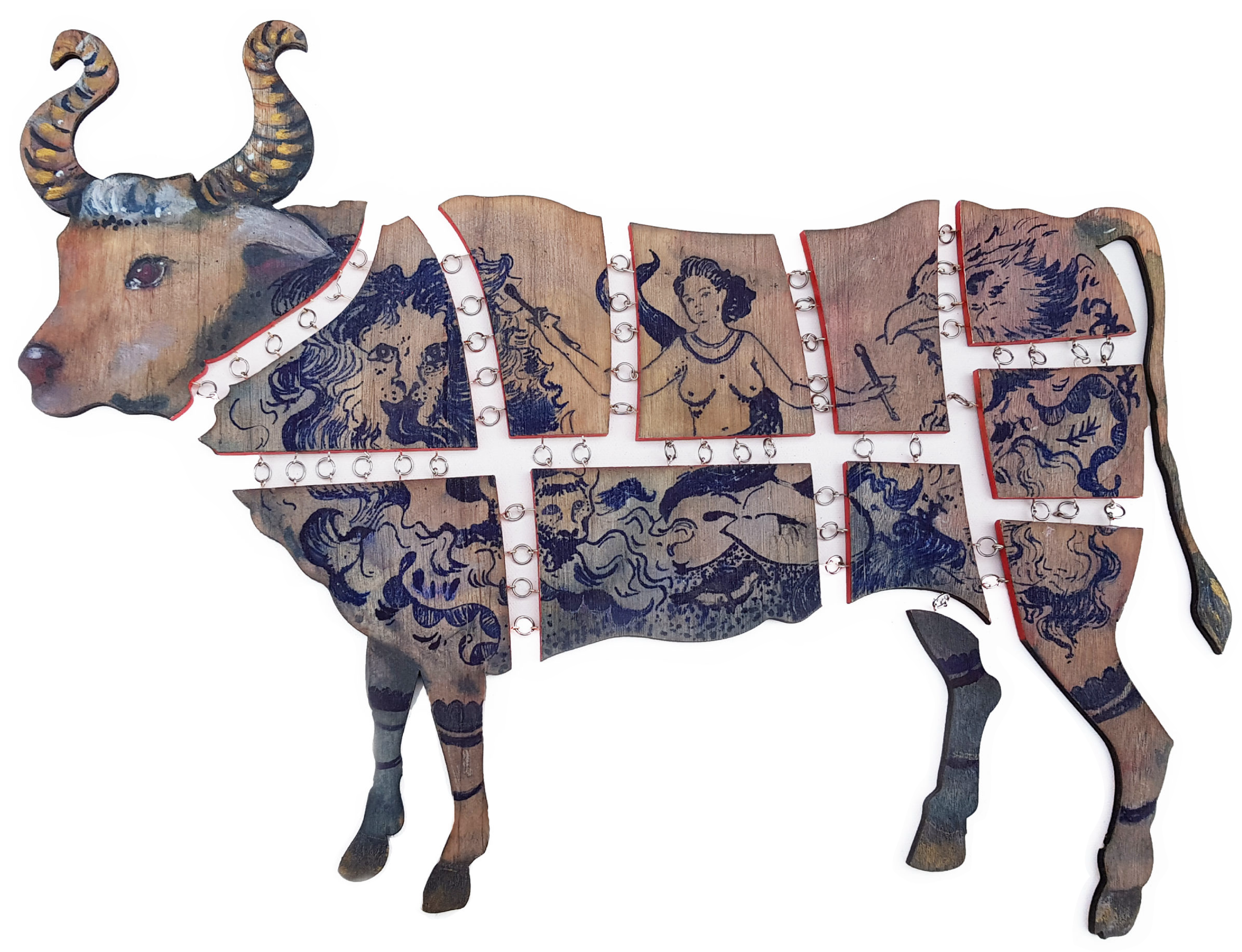 Inspired by the Ringling Brothers' "Sacred Bull" circus act, this piece critiques the commodification of cultural symbols and the appropriation of what is deemed exotic. The cow, adorned with imagery from The World tarot card, a symbol of unity and interconnectedness, is divided into butchered cuts of beef. This fragmentation represents how aspects of cultures are extracted, stripped of their original meaning, and sold for profit. By juxtaposing the sacred with the commercial, the work reflects on the effects of globalization, where cultural identities are fragmented and reshaped to fit consumer narratives. It invites viewers to question the ethics of cultural appropriation and the costs of turning what is sacred into a commodity.